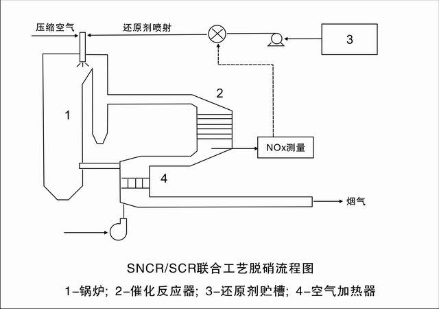 SNCR/SCR混合法脫硝系統(tǒng)主要由還原劑存儲(chǔ)與制備、輸送、計(jì)量分配、噴射系統(tǒng)、煙氣系統(tǒng)、SCR脫硝催化劑及反應(yīng)器、電氣控制系統(tǒng)等幾部分組成。