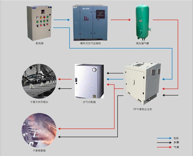 干霧抑塵系統(tǒng)采用系統(tǒng)優(yōu)化技術(shù),由干霧抑塵主機(jī),配電箱,螺桿式空氣壓縮機(jī),儲(chǔ)氣罐,水氣分配器,末端噴霧箱,超聲波萬向節(jié)噴頭,電控系統(tǒng),自動(dòng)控制系統(tǒng),水氣連接線組成。超聲波干霧抑塵系統(tǒng)廣泛適用于港口、火電廠、鋼鐵廠、礦場(chǎng)、化工廠等無組織排放場(chǎng)所固定污染源的密閉或半密閉空間抑塵。